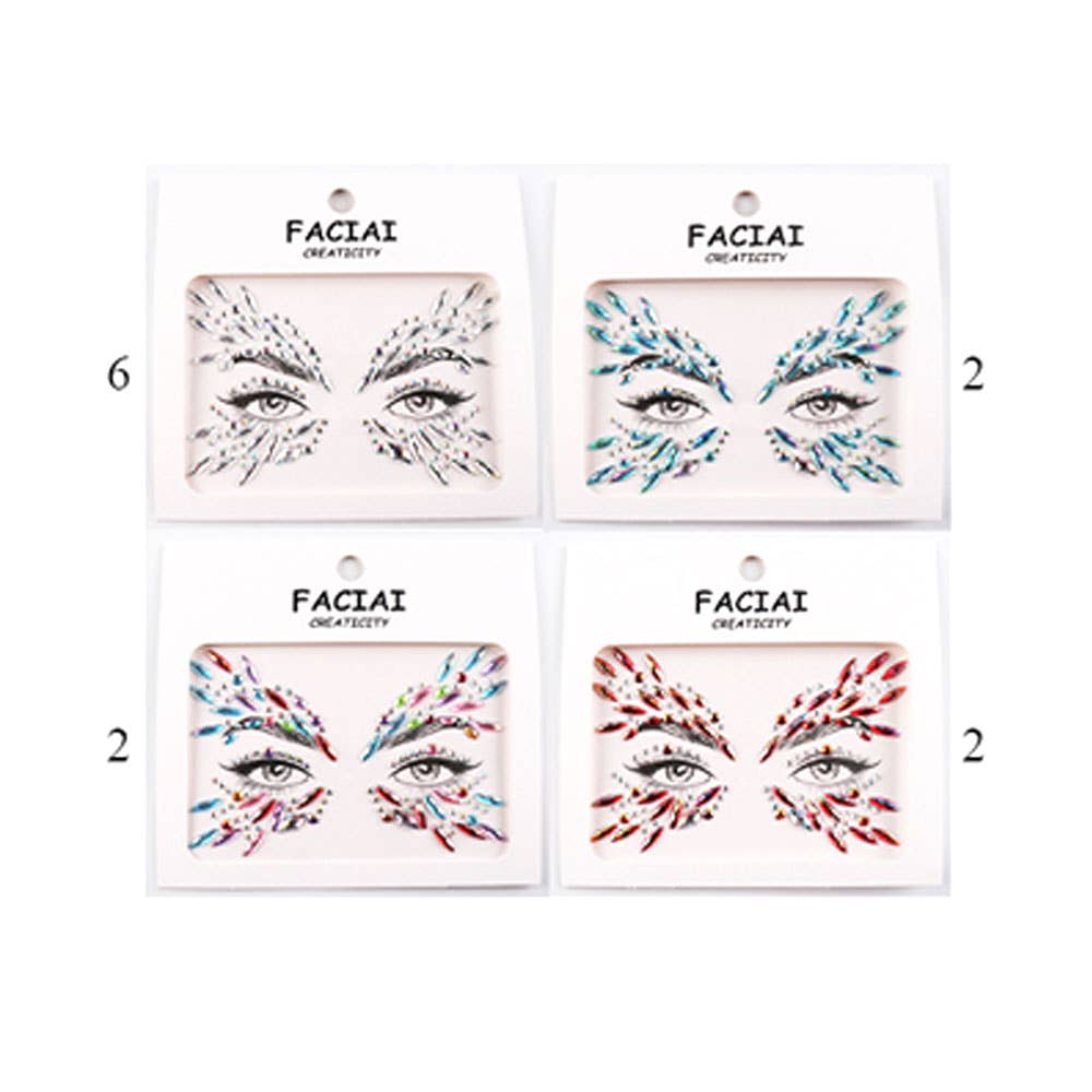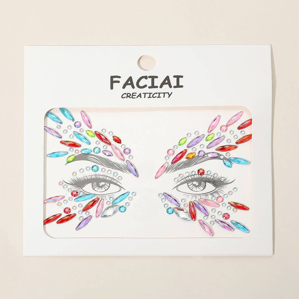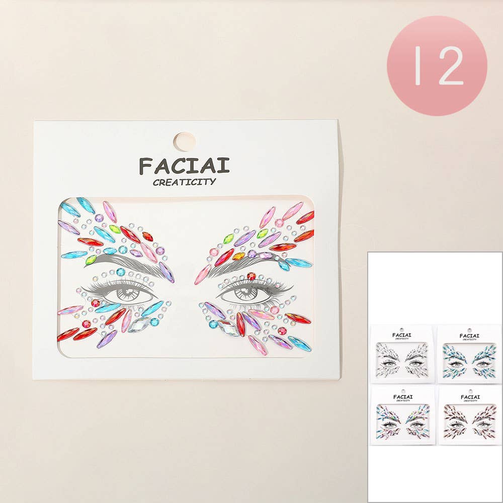12PCS - Colorful Festival Eye Gem Face Stickers Size : 6.5" X 6" Set of 12 vibrant face gem stickers in assorted styles and colors. Perfect for festivals, parties, and bold makeup looks. Easy to apply and reusable.