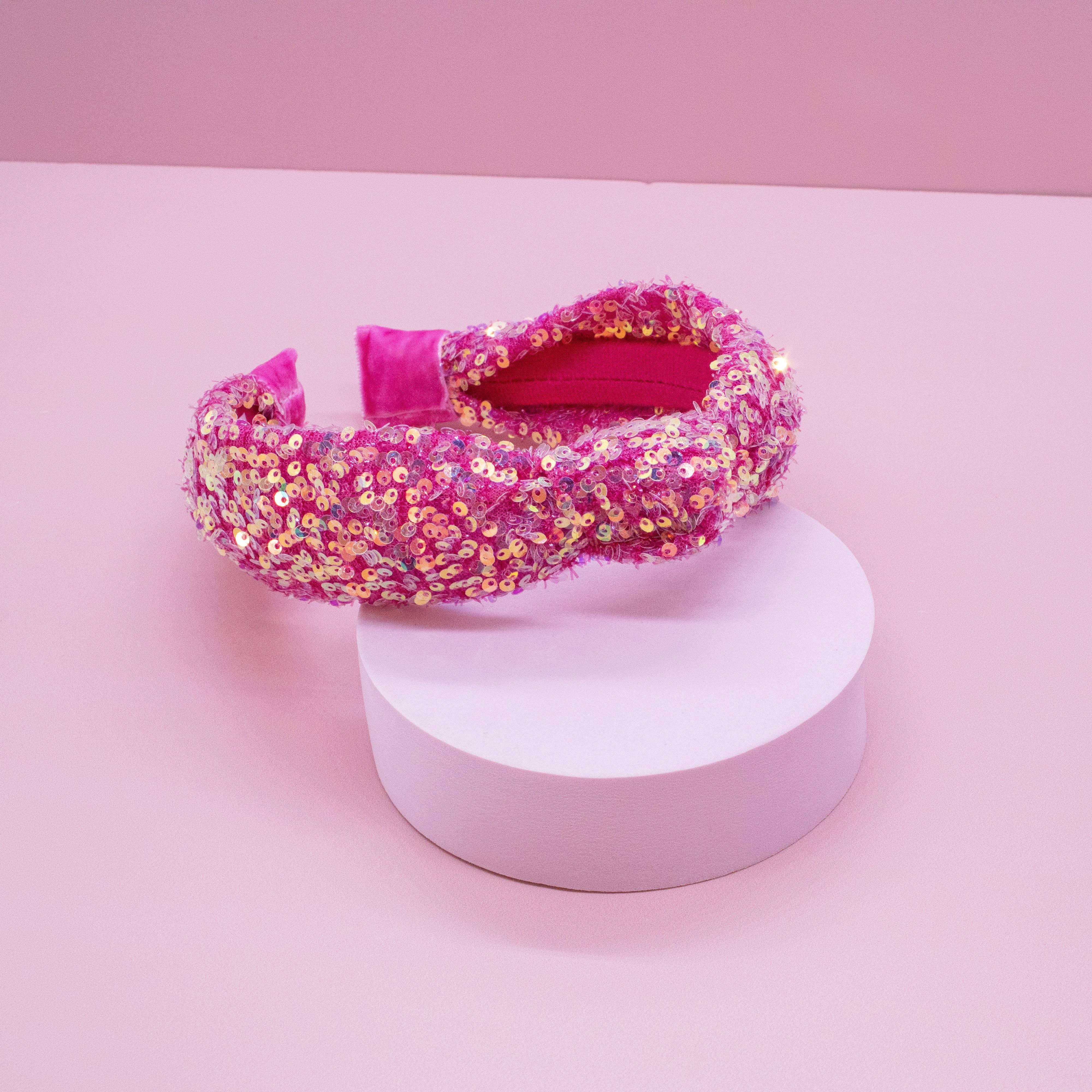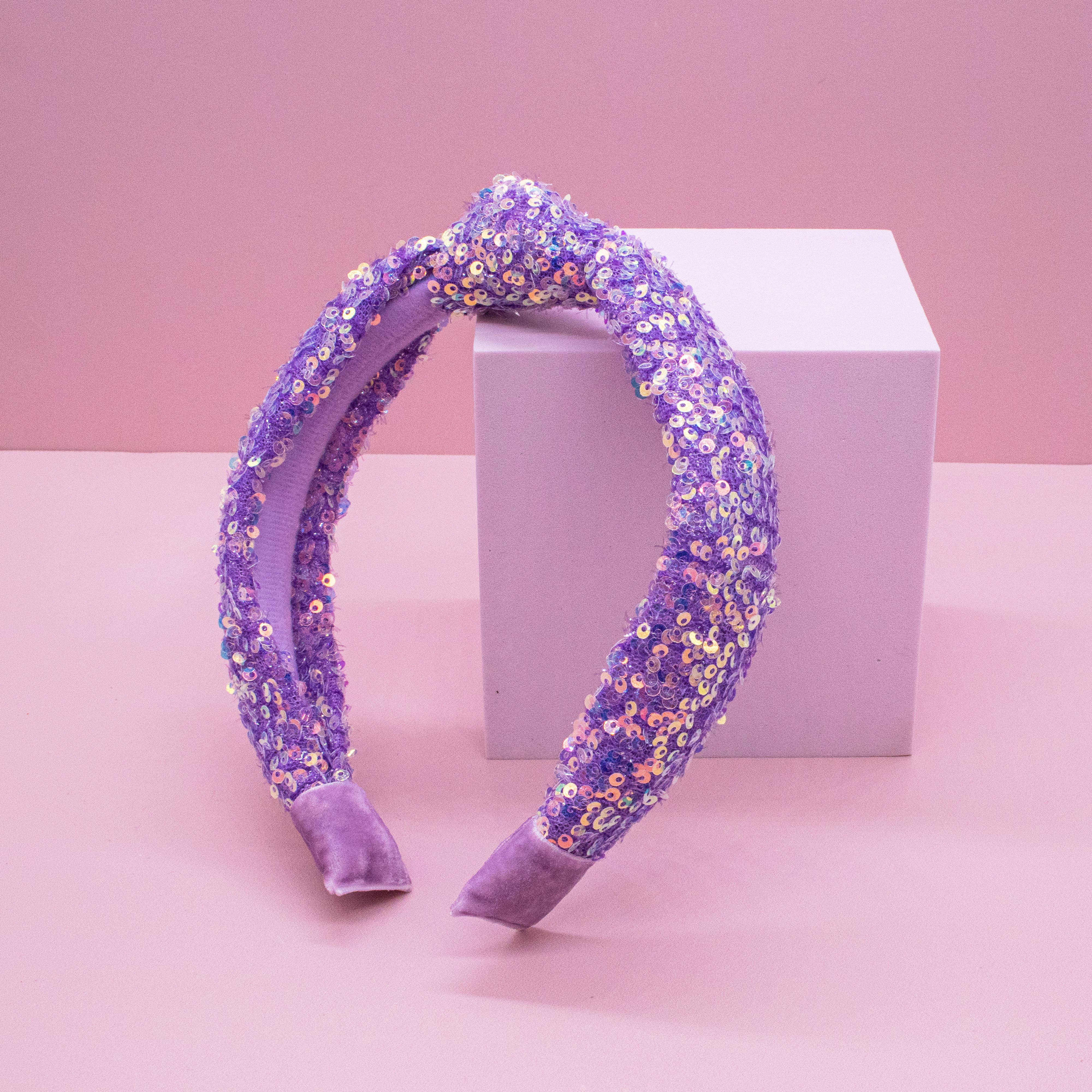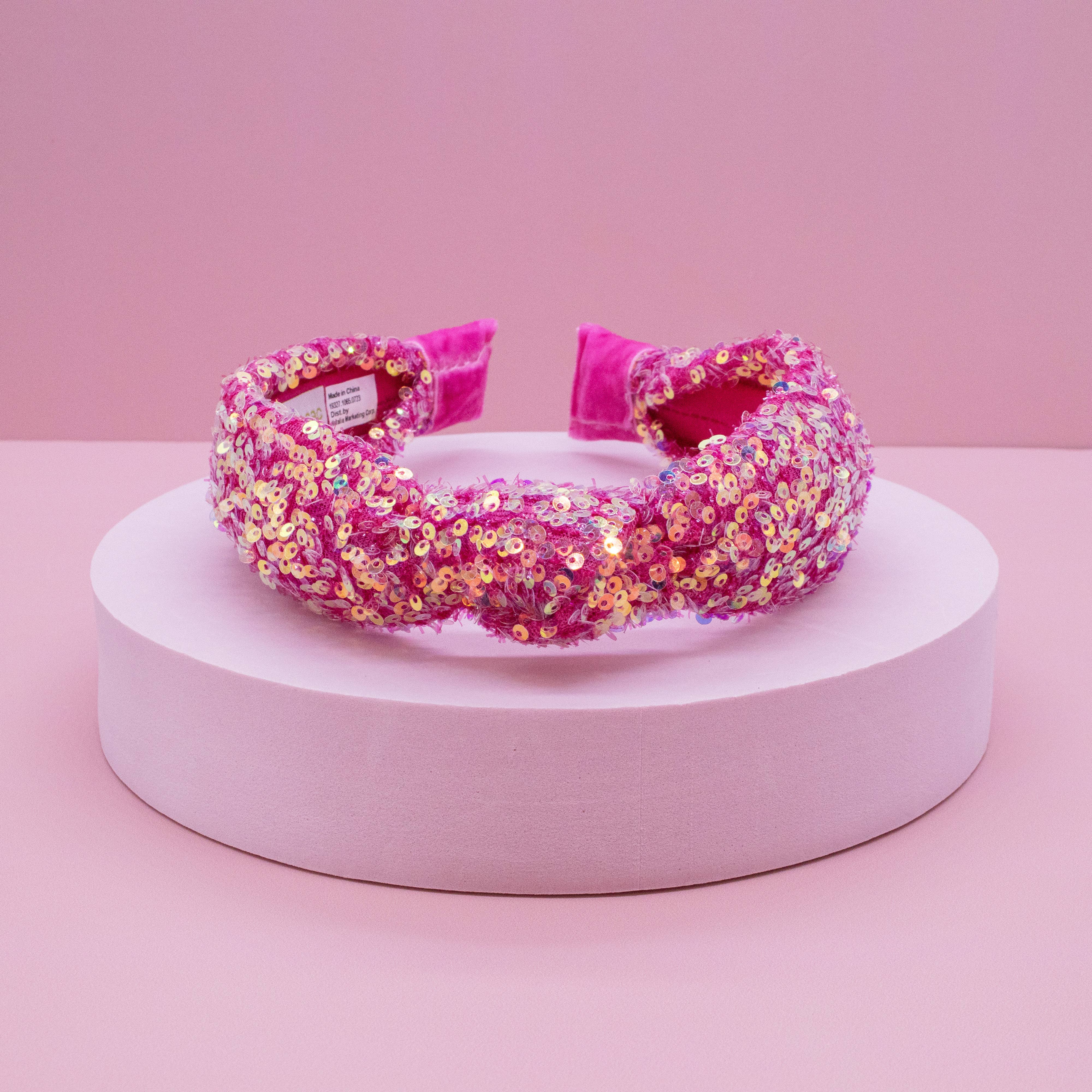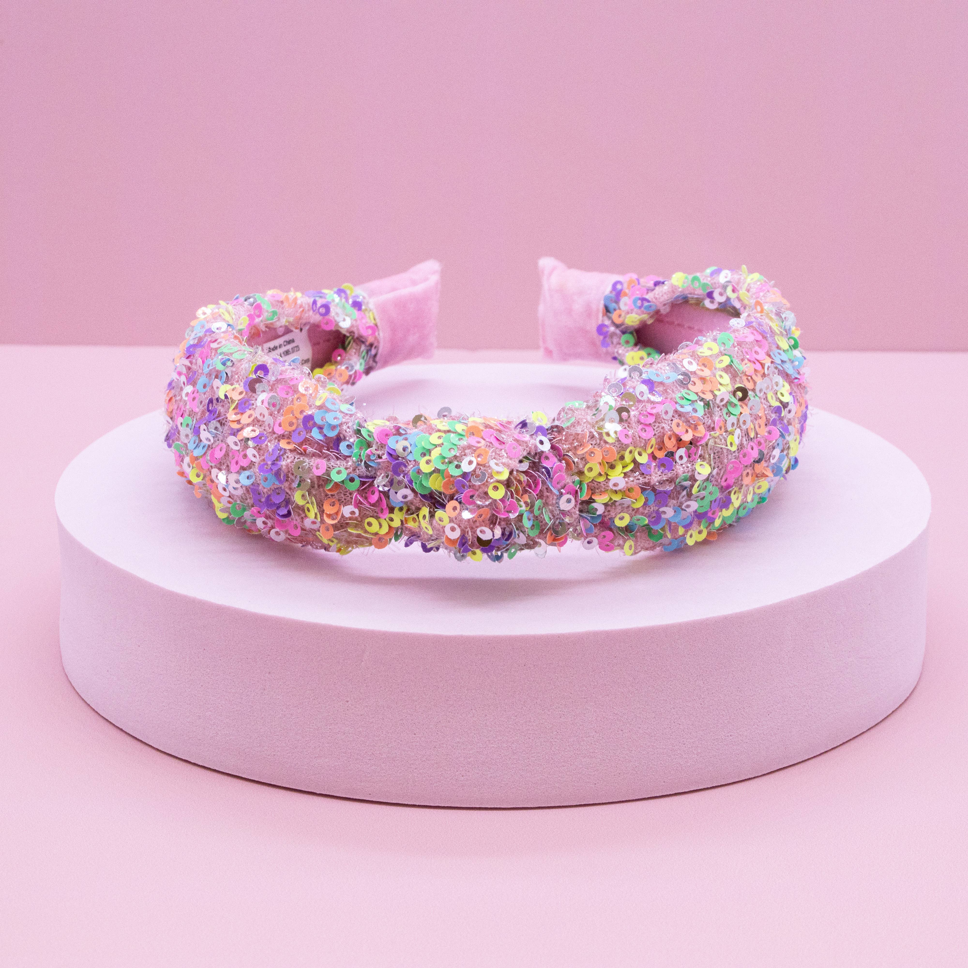 * Confetti sequin knot headband * Colors - Rainbow, White, Blue or Hot Pink * Shimmering iridescent sequins * Hard headband size 13" circumference fits best for kids to tweens * Comfortable for all-day wear Perfect for kid's fashion boutiques, hair salons, and gift shops.